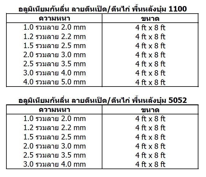 อลูมิเนียมลายตีนเป็ด, อลูมิเนียมลายตีนไก่, อลูมิเนียมลายนูนกลม, อลูมิเนียมลายนูนกลมตรง, อลูมิเนียมลาย5ขีด, อลูมิเนียมลายขีดเดียว